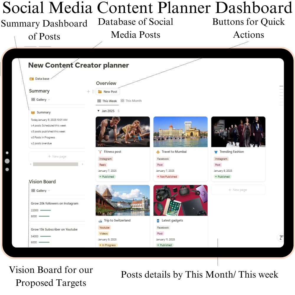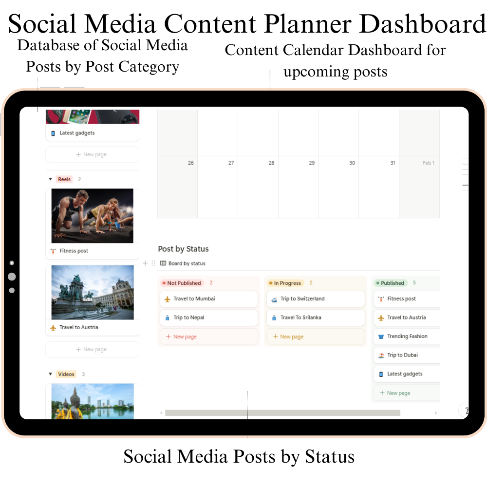 Our Social Media Notion Template is designed to help you effortlessly organize and elevate your content strategy. With sections for content planning, post scheduling, performance tracking, and idea generation, this template keeps everything in one place. Whether you're managing multiple platforms or aiming for a consistent brand presence, it’s the ultimate tool to save time, stay organized, and enhance your social media game. Perfect for entrepreneurs, influencers, and marketers looking to boost their online impact!